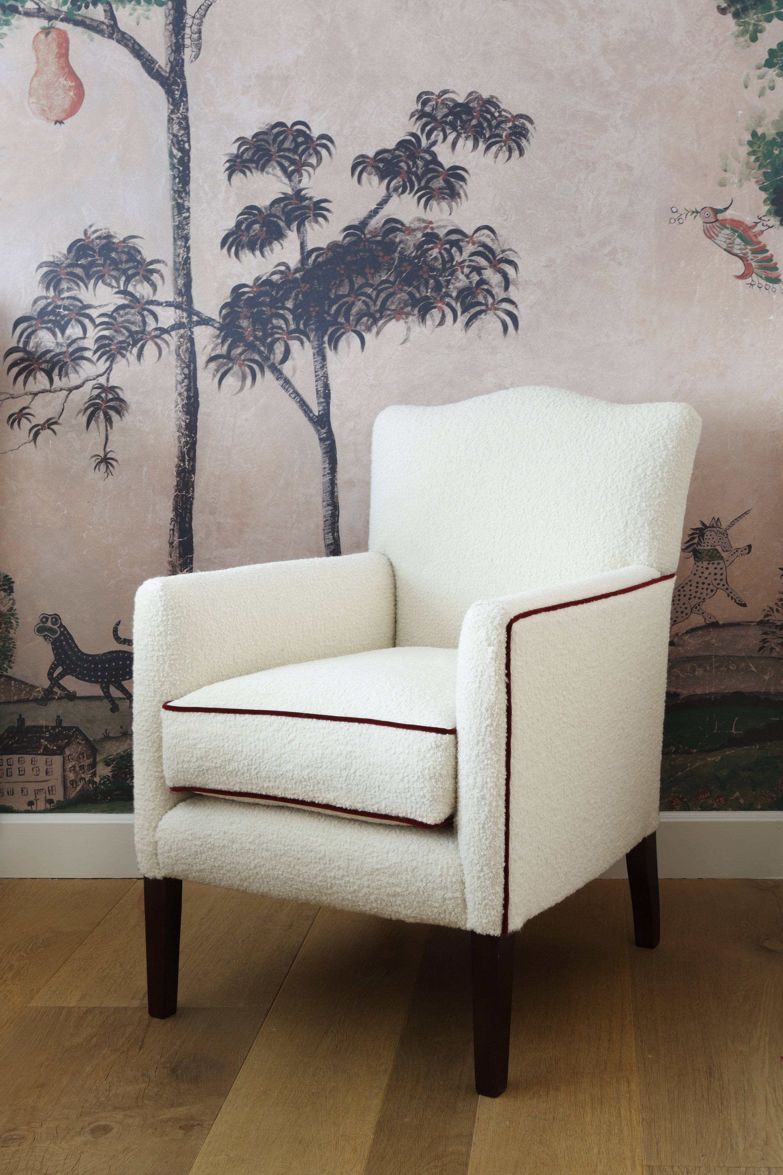 The client fell in love with Andrew Martin’s “Mythical Land” wallpaper so we wrapped the entire guest bedroom in its whimsical scenes, painting the existing joinery to blend seamlessly. Layered with a Vanderhurd rug, Lacquer Company bedside tables, and Orford lamps. The Bartholomew from our Orford collection was made in a cosy textural boucle, framed by contrast crimson piping.
